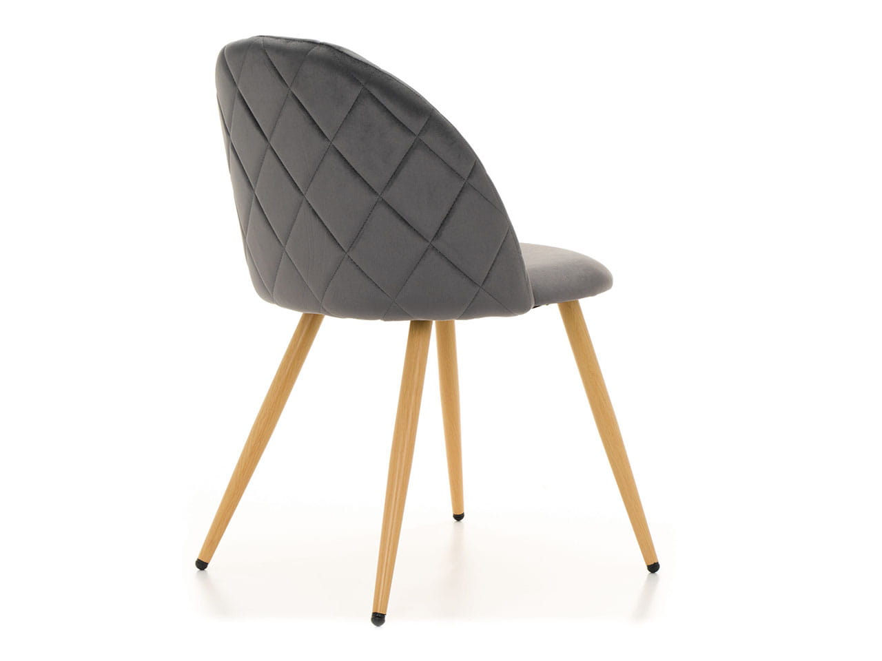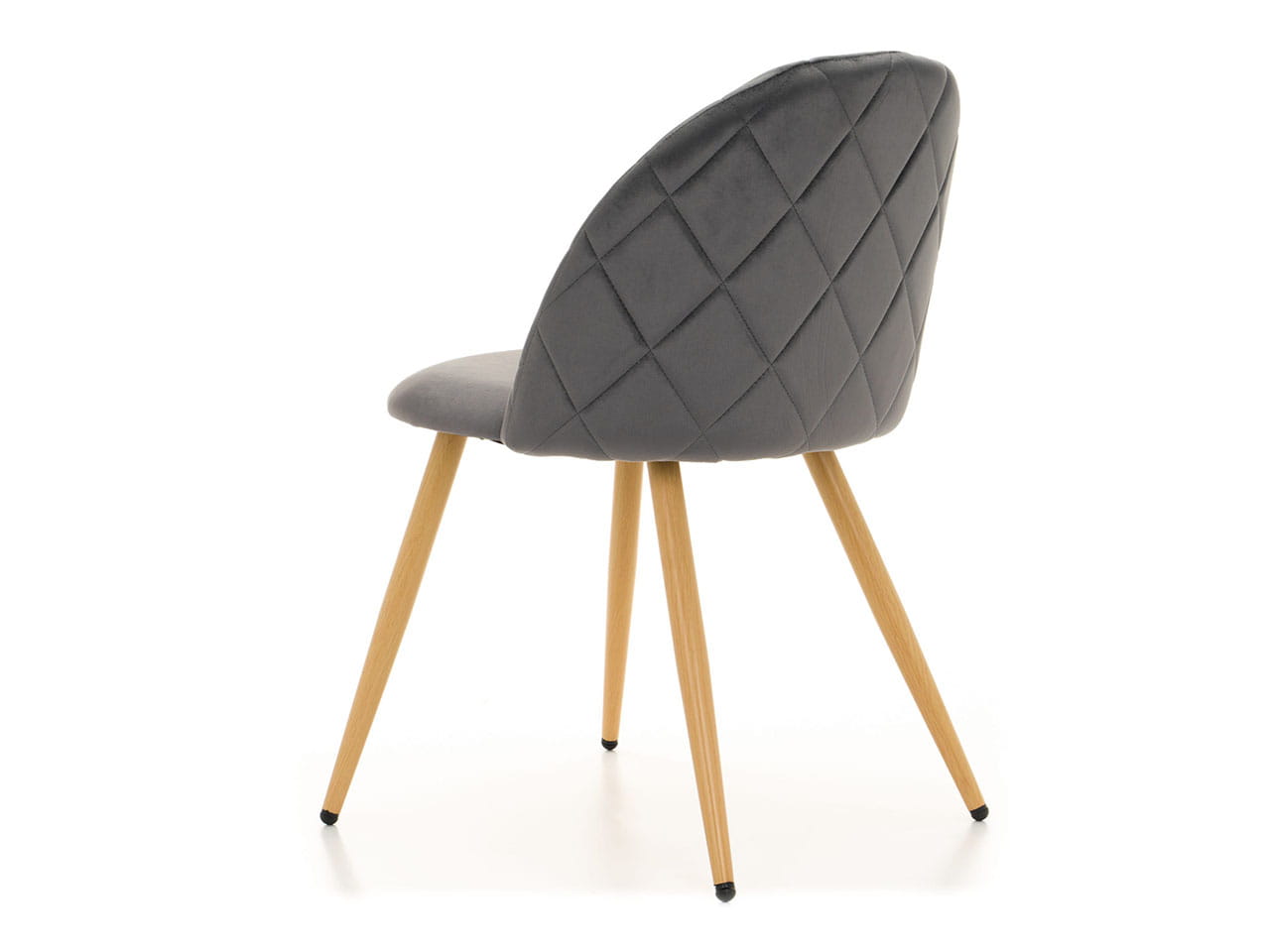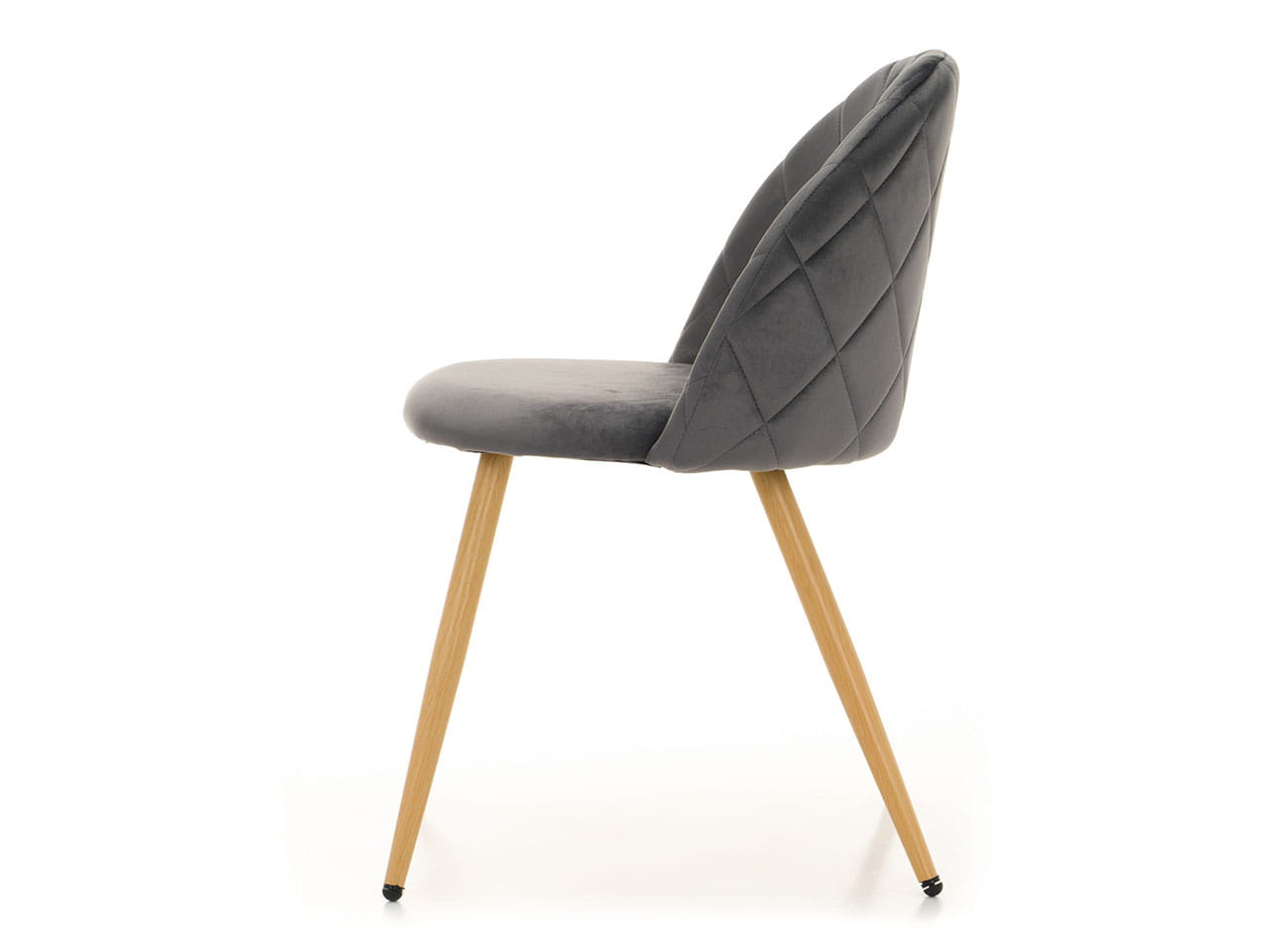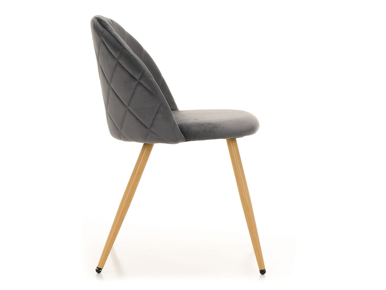 Prezentowane krzesło zostało pokryte wytrzymałą i przyjemną w dotyku, szarą tkaniną welurową, a nóżki zostały zakończone czarnymi końcówkami chroniącymi podłoże przed zarysowaniami..
