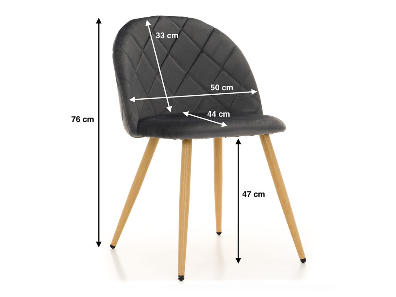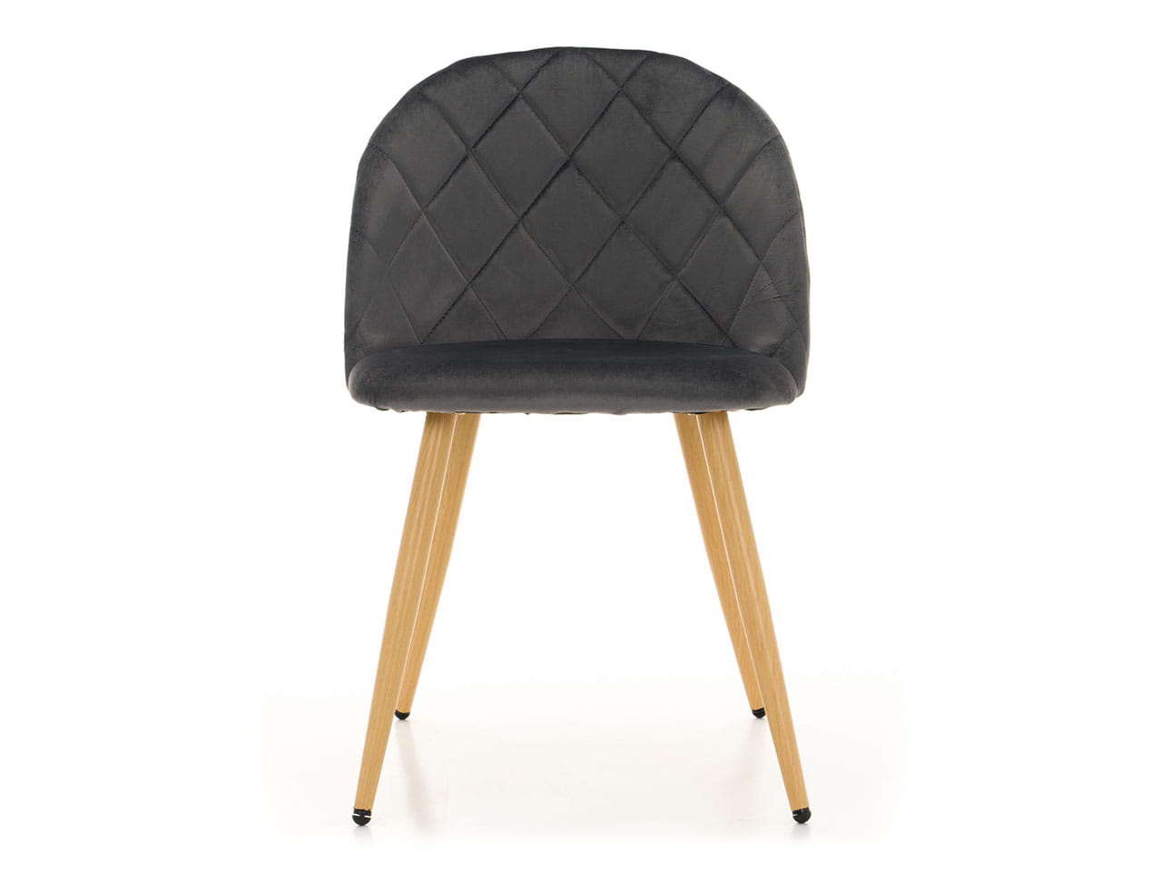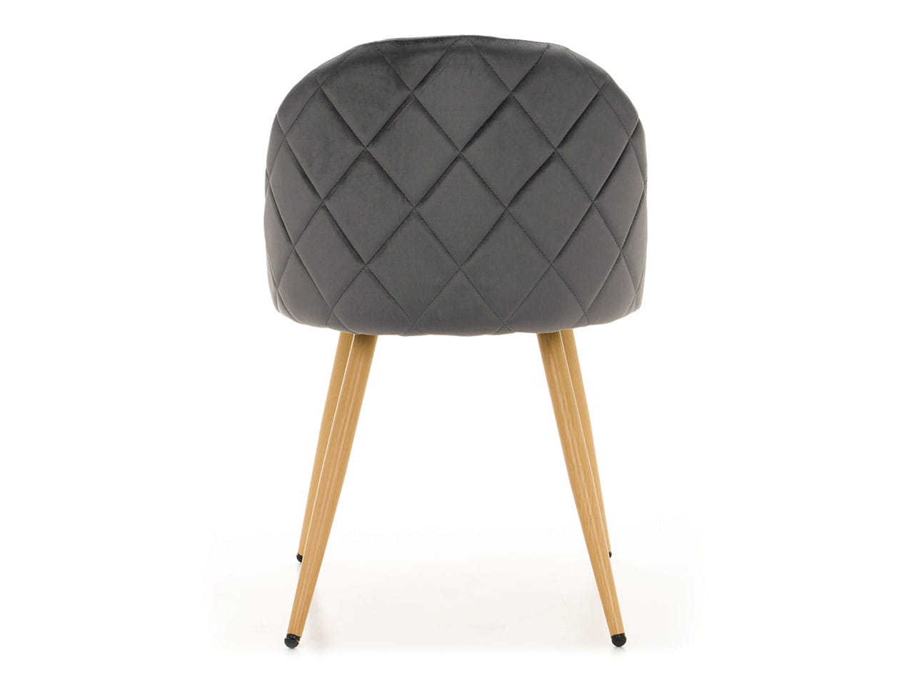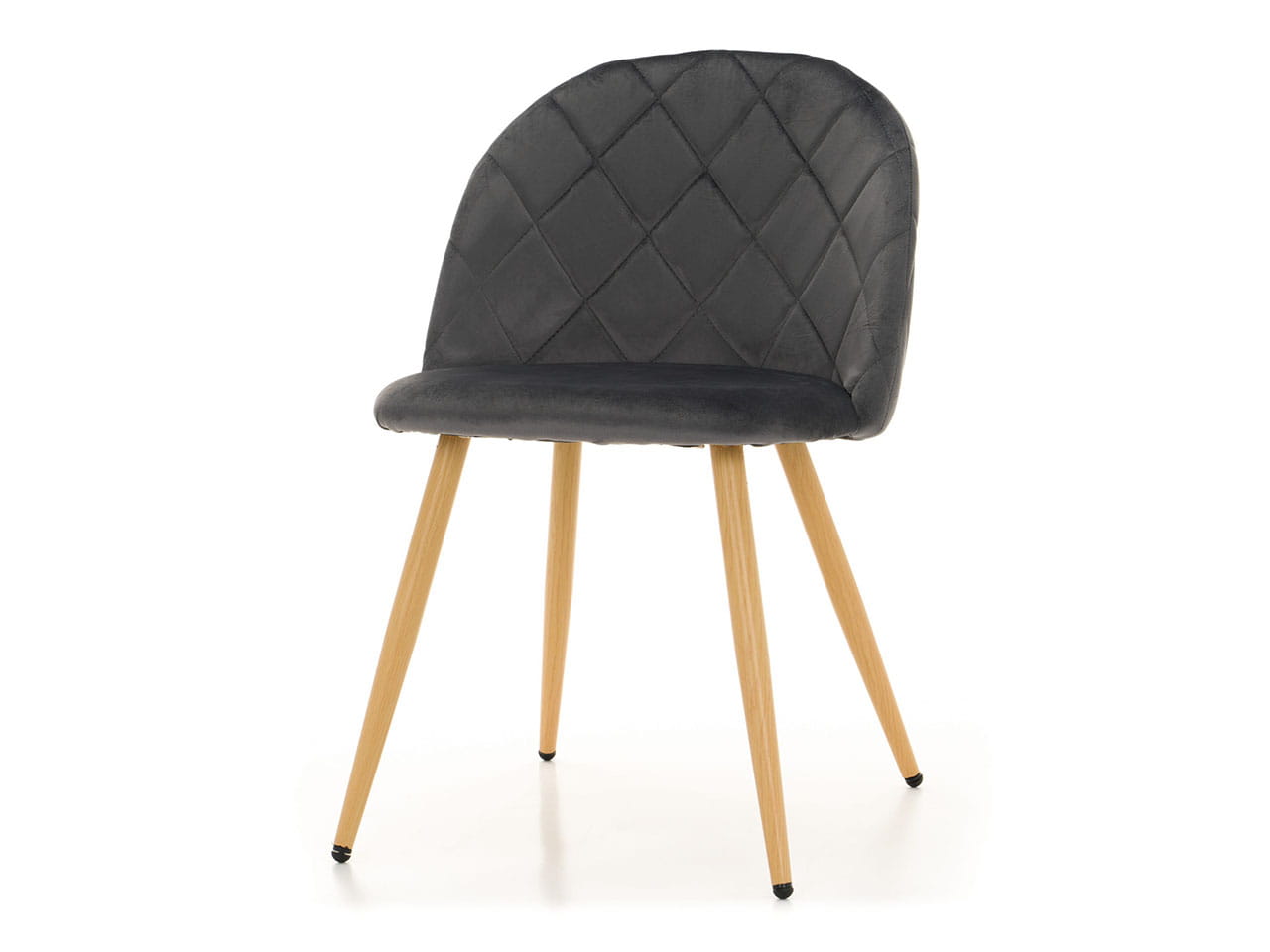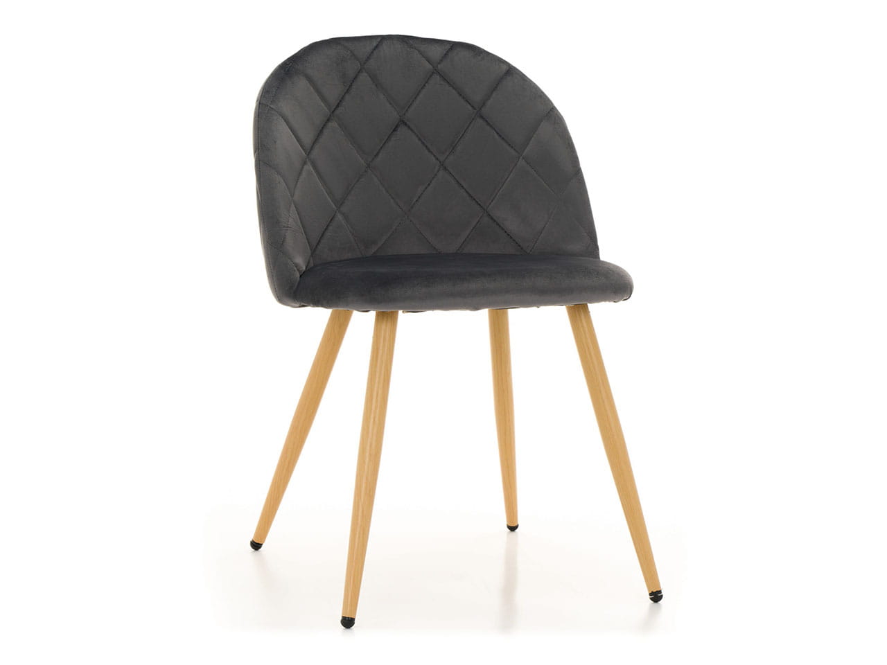 Prezentowane krzesło zostało pokryte wytrzymałą i przyjemną w dotyku, szarą tkaniną welurową, a nóżki zostały zakończone czarnymi końcówkami chroniącymi podłoże przed zarysowaniami..