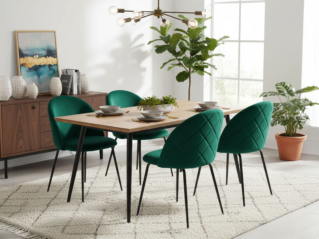 Tapicerka z pewnością przyciągnie uwagę naszego krzesła swoją finezją. Zielone obicie welurem o nieskazitelnej miękkości w połączeniu z wyrafinowanymi przeszyciami w kształcie rombów na tyle oparcia nadaje niepowtarzalnego stylu i świadczy o starannie dobranych szczegółach.