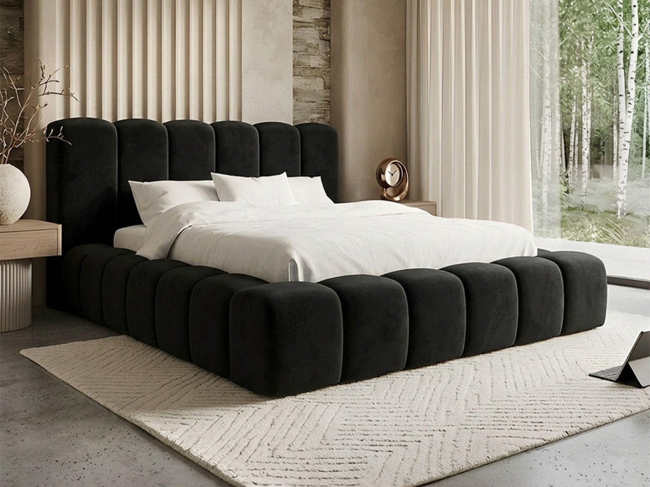 Łóżko tapicerowane 140x200 Calypso czarne z pojemnikiem na pościel i stelażem metalowym