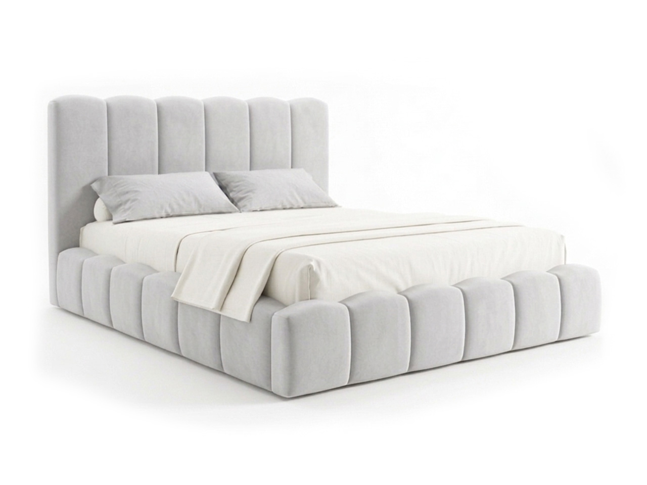 Zagłówek zbudowany z pionowych, miękkich segmentów przyciąga spojrzenie swoją proporcją i subtelną geometrią. Nie dominuje, lecz naturalnie wypełnia przestrzeń, tworząc tło dla odpoczynku. W tej formie kryje się wyrafinowanie, które nie potrzebuje ozdobników.