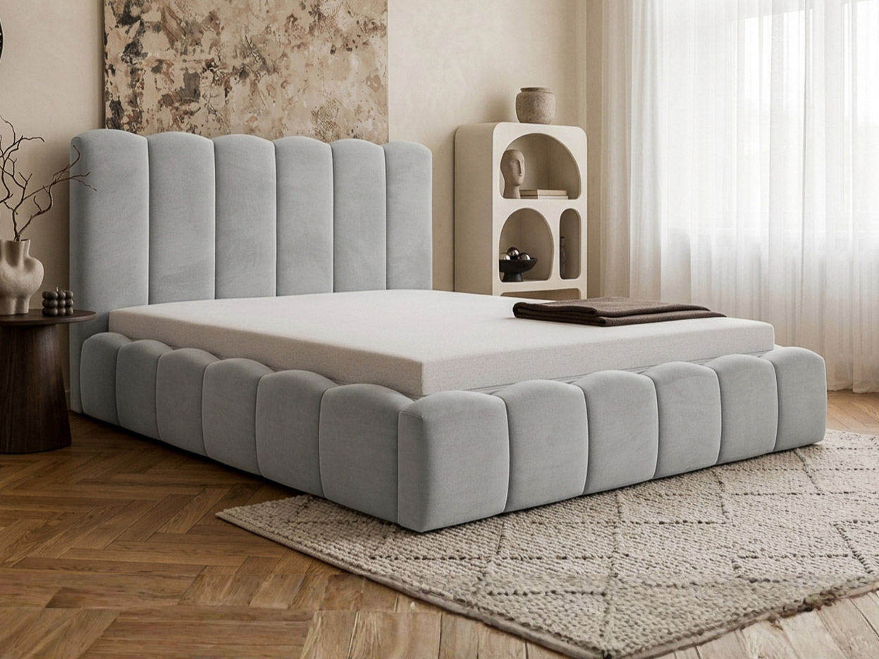 Bryła łóżka opiera się na powtarzalności i rytmie. Każde tapicerowane wybicie tworzy harmonijną całość - jak miękko rzeźbione moduły, które układają się w spokojny, elegancki układ. To właśnie ta powtarzalność nadaje mu charakteru: regularność, która uspokaja przestrzeń, porządkuje ją i jednocześnie nadaje jej luksusowej głębi.