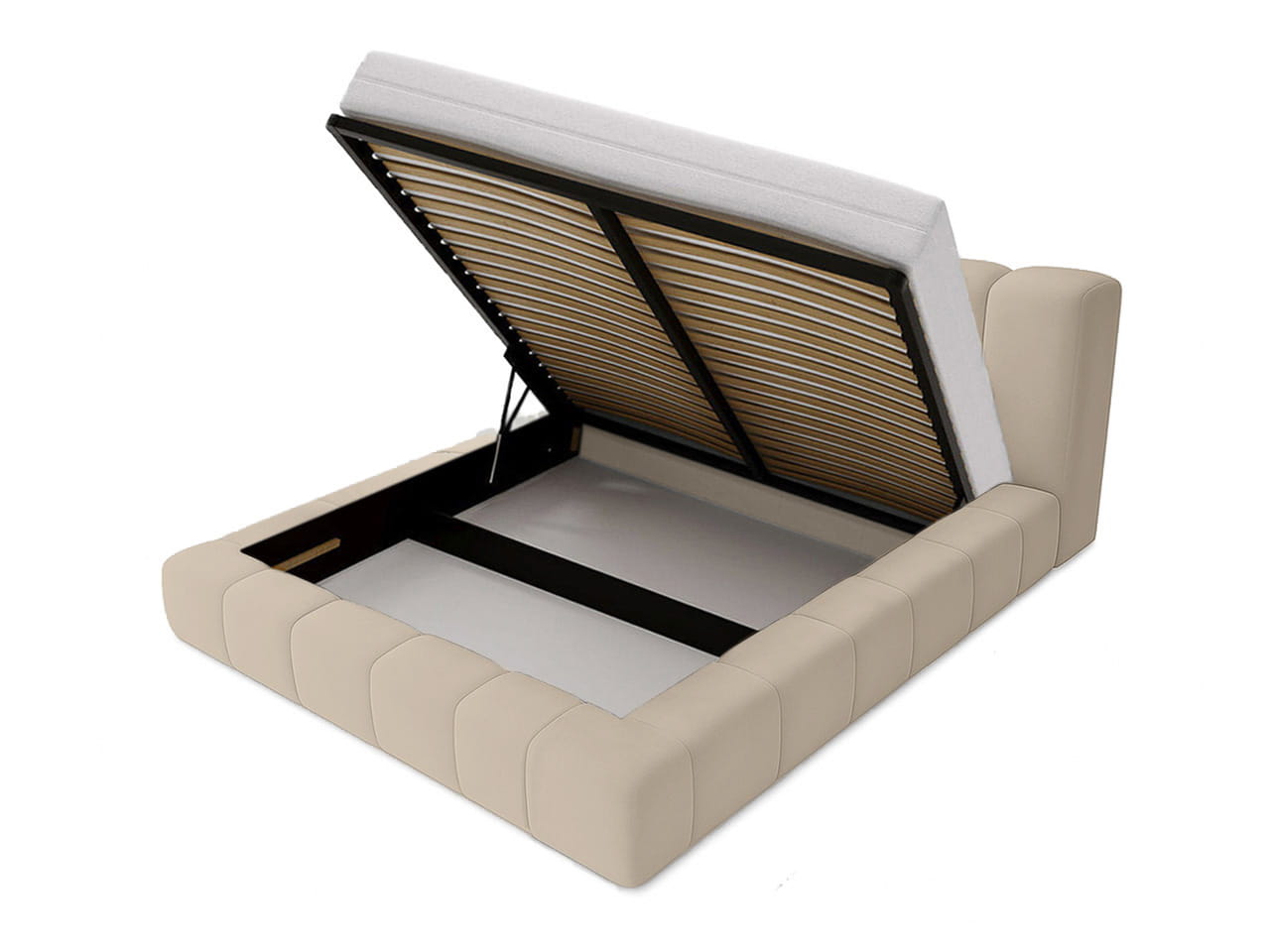 Pod metalowym stelażem, kryje się obszerny pojemnik na pościel, otwierany przy pomocy podnośników gazowych. Spód wykonano z białej płyty HDF, co nadaje całości estetyczny wygląd i zapewnia trwałość. To rozwiązanie, które dyskretnie przechowuje koce, dodatkową pościel czy poduszki, jednocześnie pozostając niewidoczne dla oka.