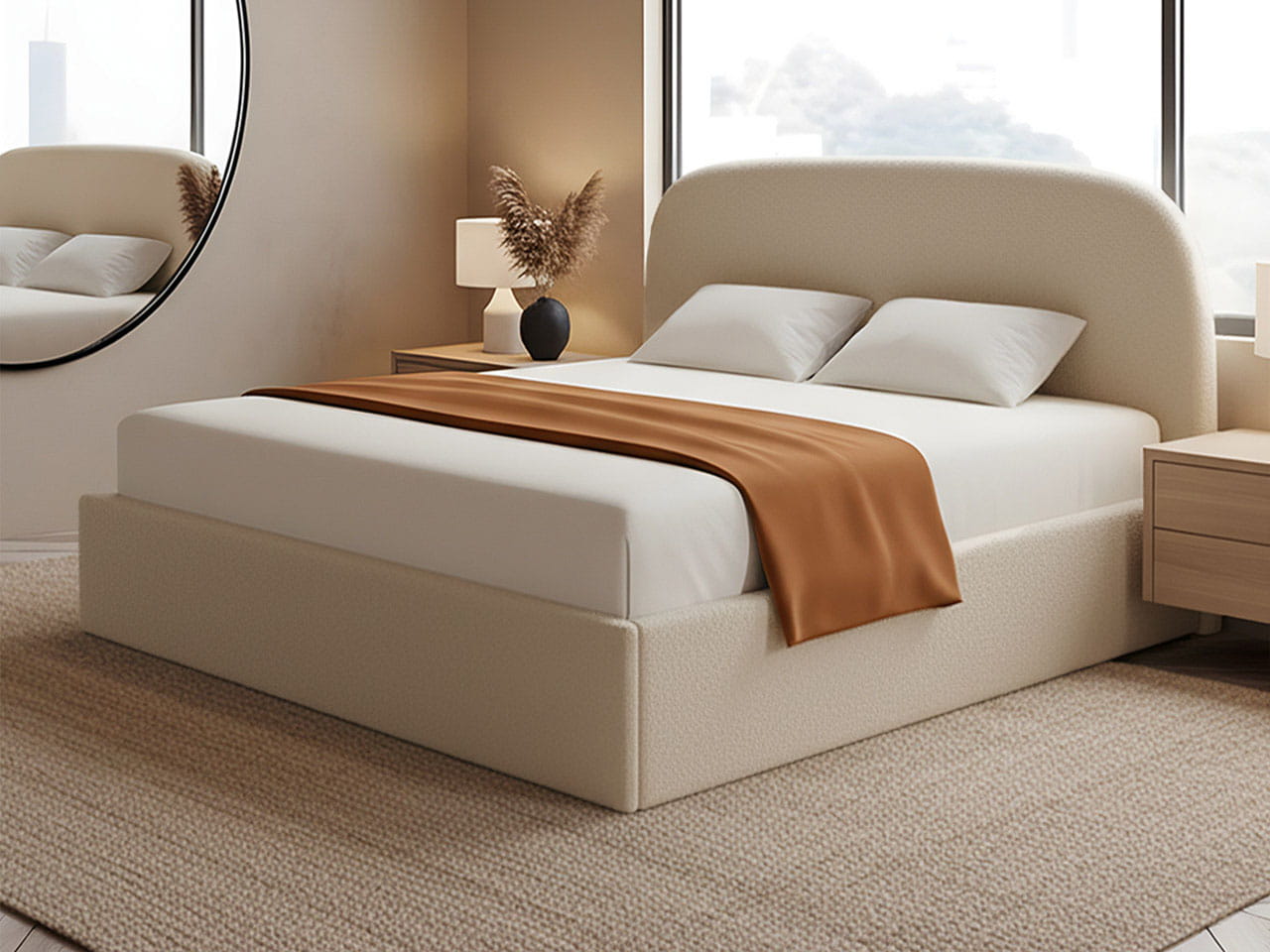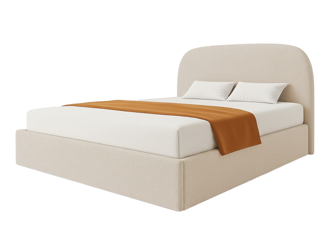 Łóżko tapicerowane Velia to propozycja, która koi zmysły i tworzy atmosferę relaksu. Harmonijna forma, zaokrąglone wezgłowie i tapicerka z barankowej tkaniny boucle przenoszą Cię do wnętrz inspirowanych stylem japandi, boho i śródziemnomorskim. Velia to komfort zaklęty w spokojnych liniach i szlachetnym minimalizmie.