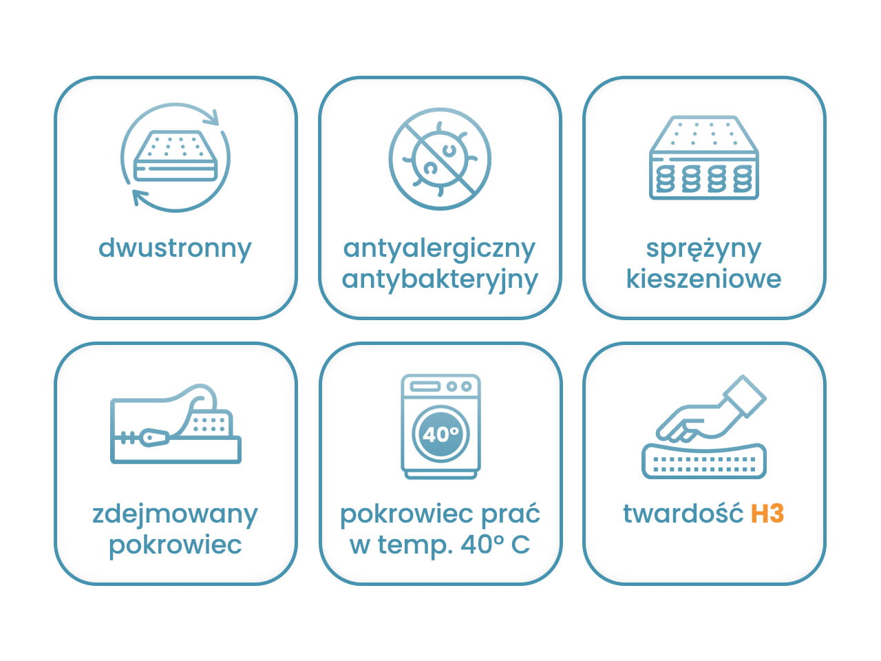 - Dwustronna twardość H3 - optymalne, średniotwarde podparcie dla osób o różnej wadze i preferencjach.