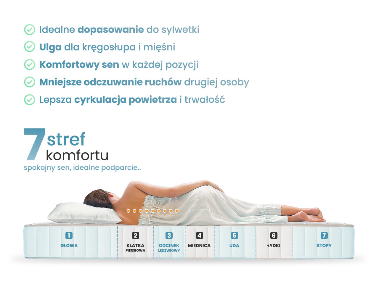 Każda strefa została zaprojektowana tak, by precyzyjnie dopasować się do konkretnych partii ciała, niezależnie od pozycji, w jakiej śpisz. Dzięki temu kręgosłup utrzymuje naturalne ułożenie, a mięśnie mają szansę na pełną regenerację.