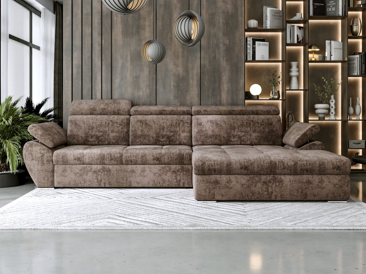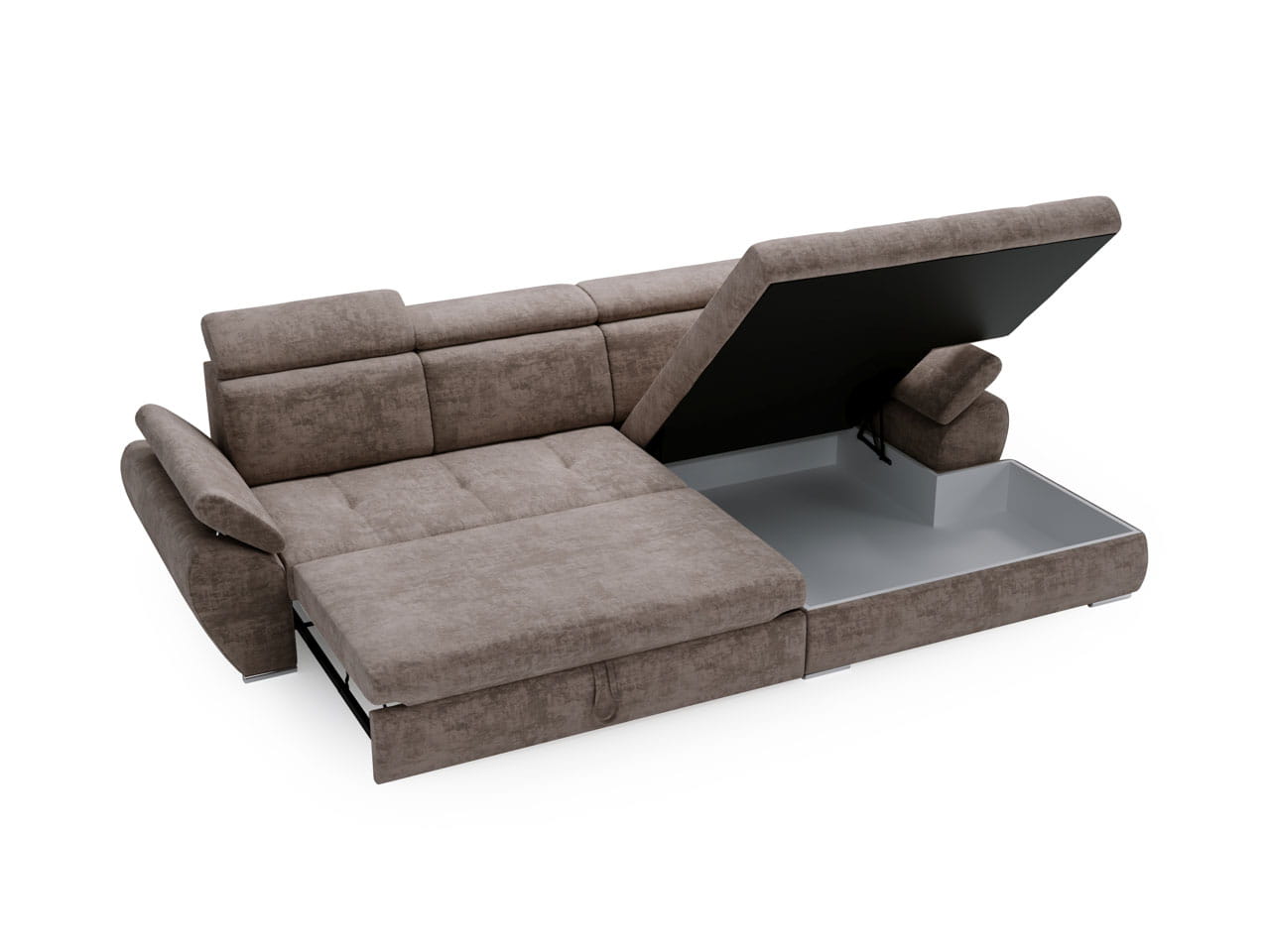W narożniku Sydney brązowy tkanina Loris o miękkim wykończeniu dodaje meblowi przytulnego, ale zarazem eleganckiego charakteru. Mebel został zaprojektowany z myślą o funkcjonalności. Jego praktyczna funkcja spania sprawia, że narożnik ten jest idealny dla gości lub jako dodatkowe miejsce do spania. Pojemnik na pościel to doskonałe miejsce na przechowywanie dodatkowej pościeli, lub poduszek, co pomaga utrzymać porządek w Twoim salonie.
